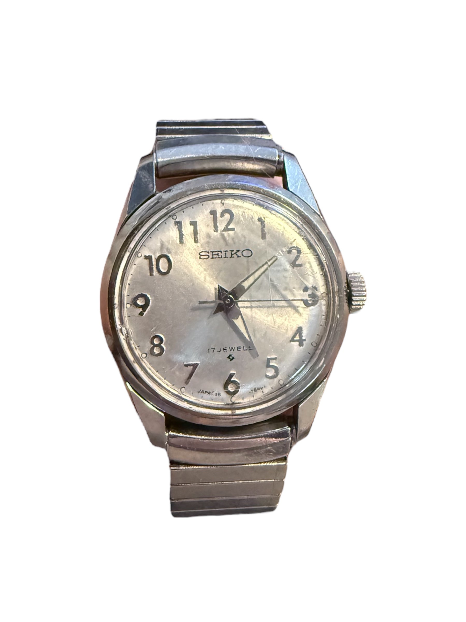 This classic vintage men's Seiko watch features a durable silver case and a flexible, expandable wristband for a secure and comfortable fit.